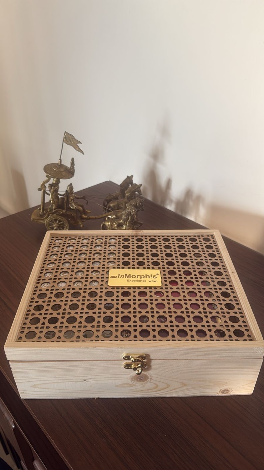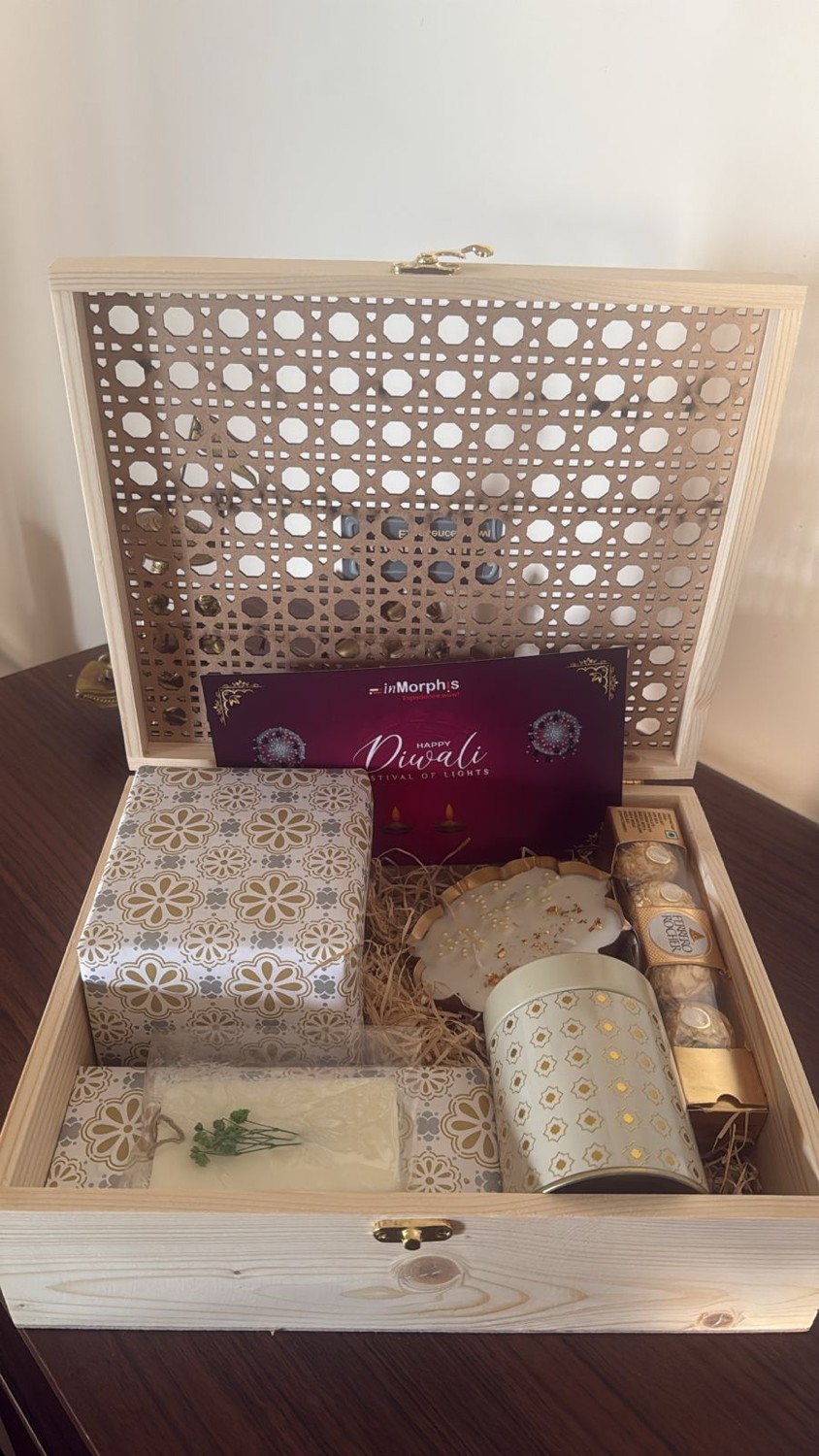 Celebrate in style with this premium wooden reusable gift box, beautifully packed with thoughtful essentials — a 4-in-1 car charger, scalp massager, car perfume wax sachet, Ferrero Rocher chocolate stick, urli candle, metal jar of mixed nuts, and a custom message card. Perfect for corporate gifting, celebrations, or festive occasions.